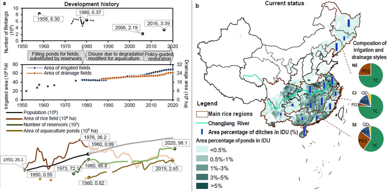 EVO视讯官网杜耘、张亮团队,与中国农科院、华中农业大学、中科院重庆绿色智能研究院、加拿大滑铁卢大学及湖北、江西、辽宁省农科院等单位合作,系统调查了我国水稻灌排系统的开展历程及小水体利用现状,发现近几十年来由于填塘造田和自然损毁,我国稻区的水塘数量已大幅减少,现存水塘有的缺乏维护而淤积严重、有的改为精养渔塘,80%都不再参与水稻灌排(图1)。然而,基于前期建立的涵盖中国417个水体的数据集,团队发现相比于湖泊、水库等大型水体,小水体的氮磷截留能力更强。稻区小水体的减少和弃用,增加了水稻生产的清水消耗量和污水排放量,从而提高了水稻生产的水足迹。同时,过度依赖远距离水源的灌溉模式,也增加了稻田在干旱天气的减产风险。